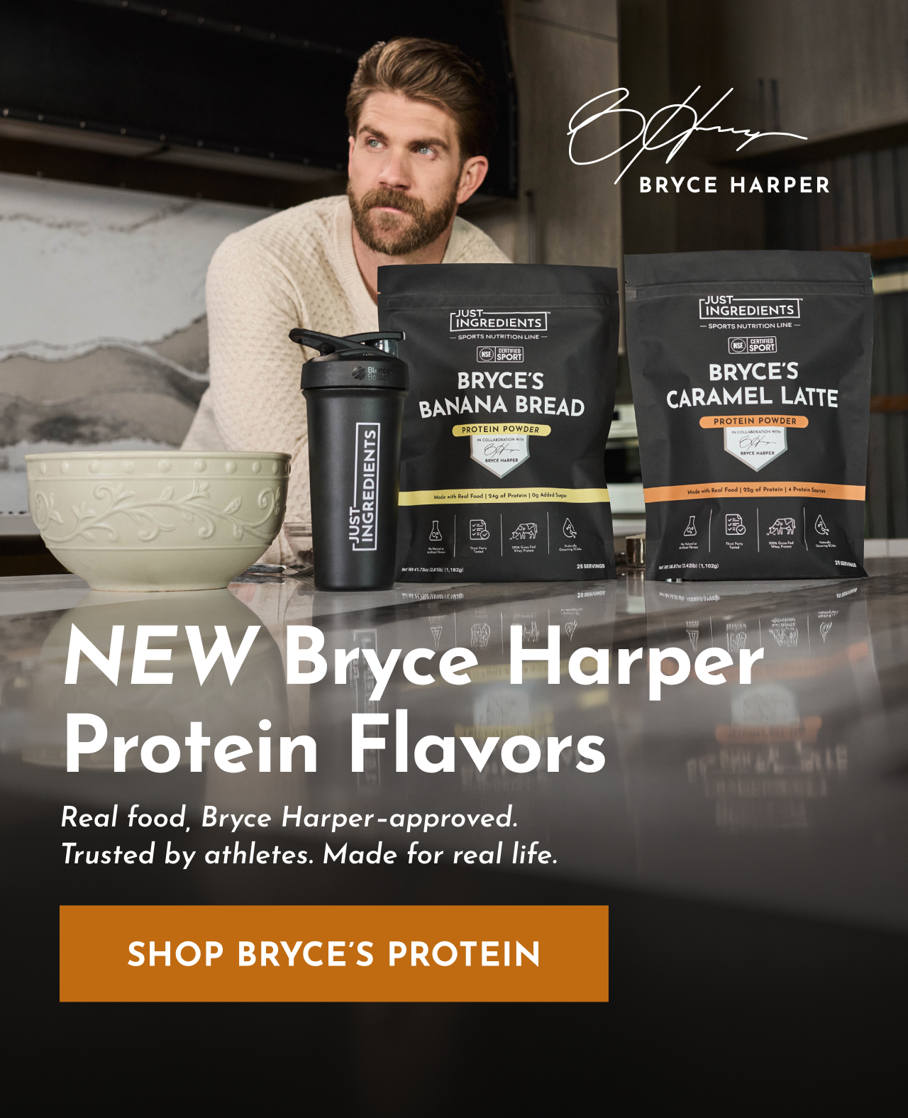 BRYCE HARPER, pro baseball player, fuels his body with real, whole foods. That’s why he’s been using Just Ingredients products for years.